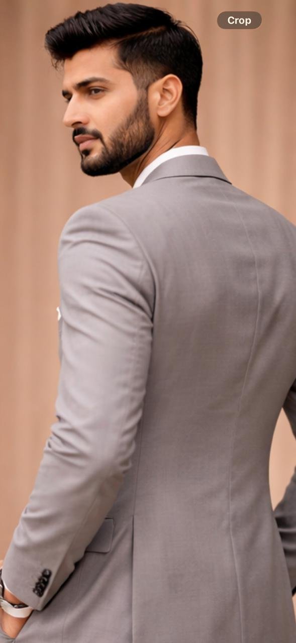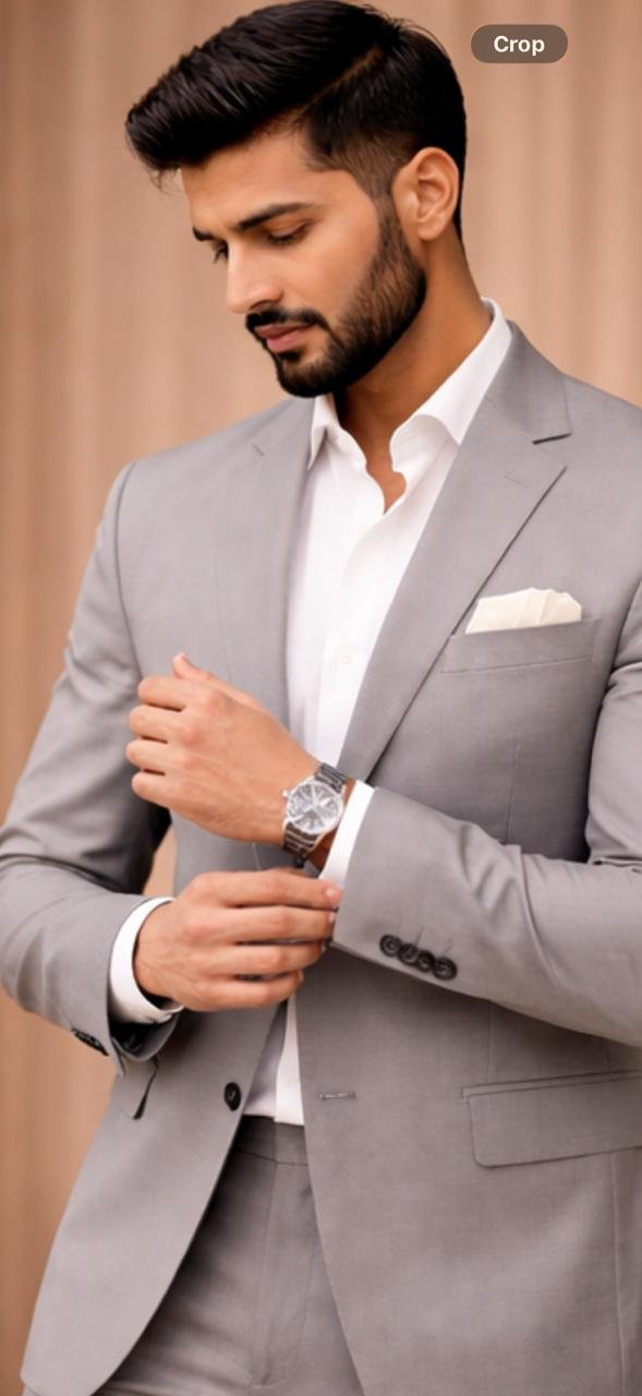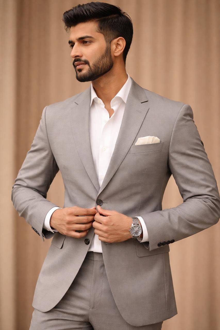 This Light Grey Tailored Suit features a refined single-breasted blazer designed for a sharp, modern silhouette. It showcases a clean notched lapel, structured shoulders, and classic flap pockets, finished with a neatly folded ivory pocket square that adds a subtle contrast and elevated elegance.