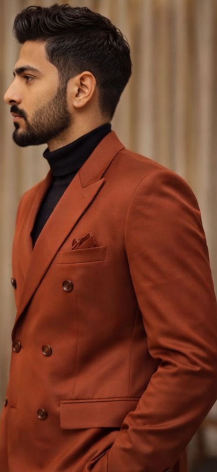 The Rust / Burnt Terracotta Double-Breasted Suit features a bold yet refined silhouette, tailored for a sharp, structured fit. The double-breasted blazer is designed with distinctive peak lapels and matching front buttons, delivering a confident, contemporary look with classic appeal.